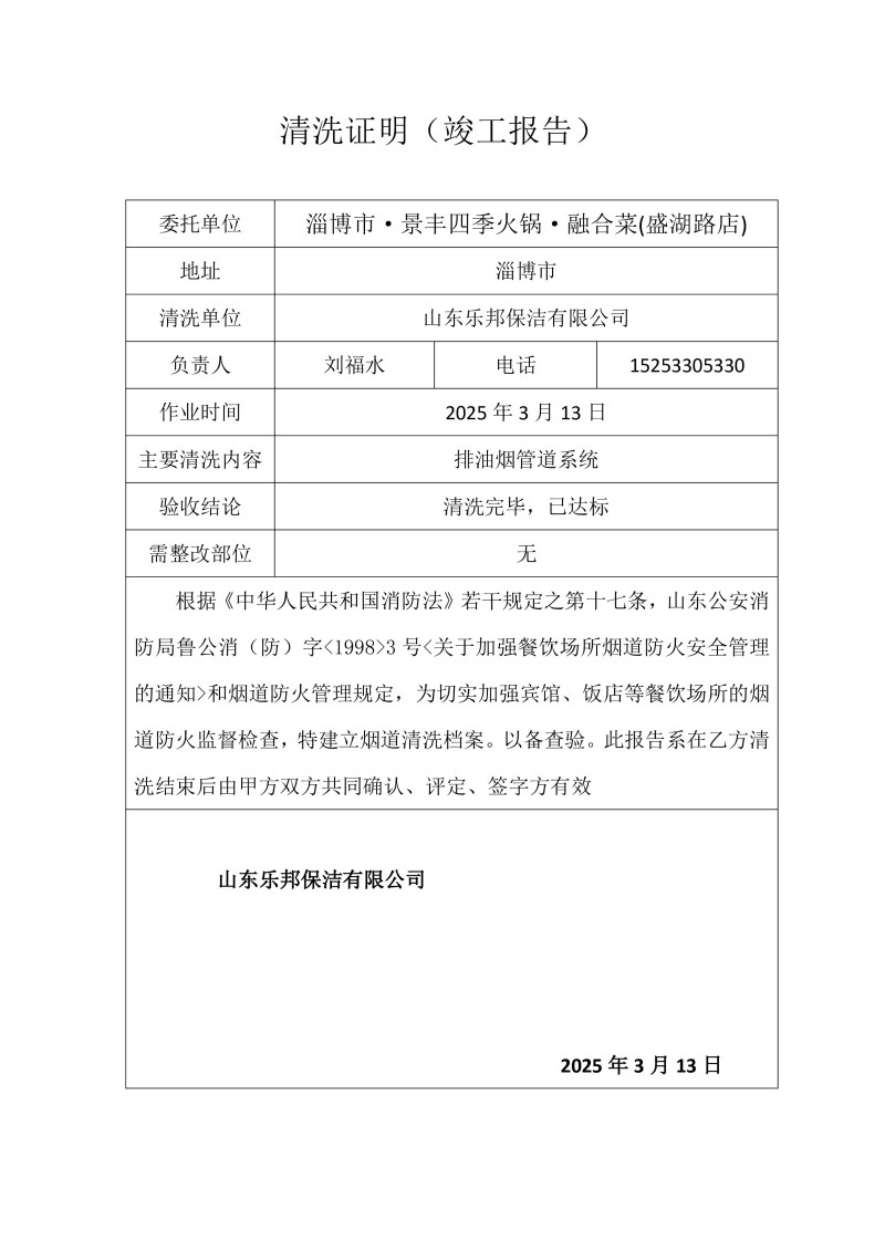 淄博市·景豐四季火鍋·融合菜(盛湖路店)清洗報告25.3.13