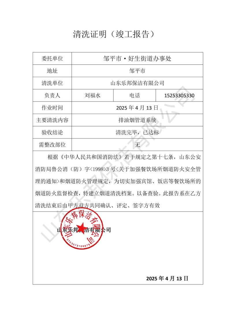 鄒平市·好生街道辦事處清洗報(bào)告25.4.13