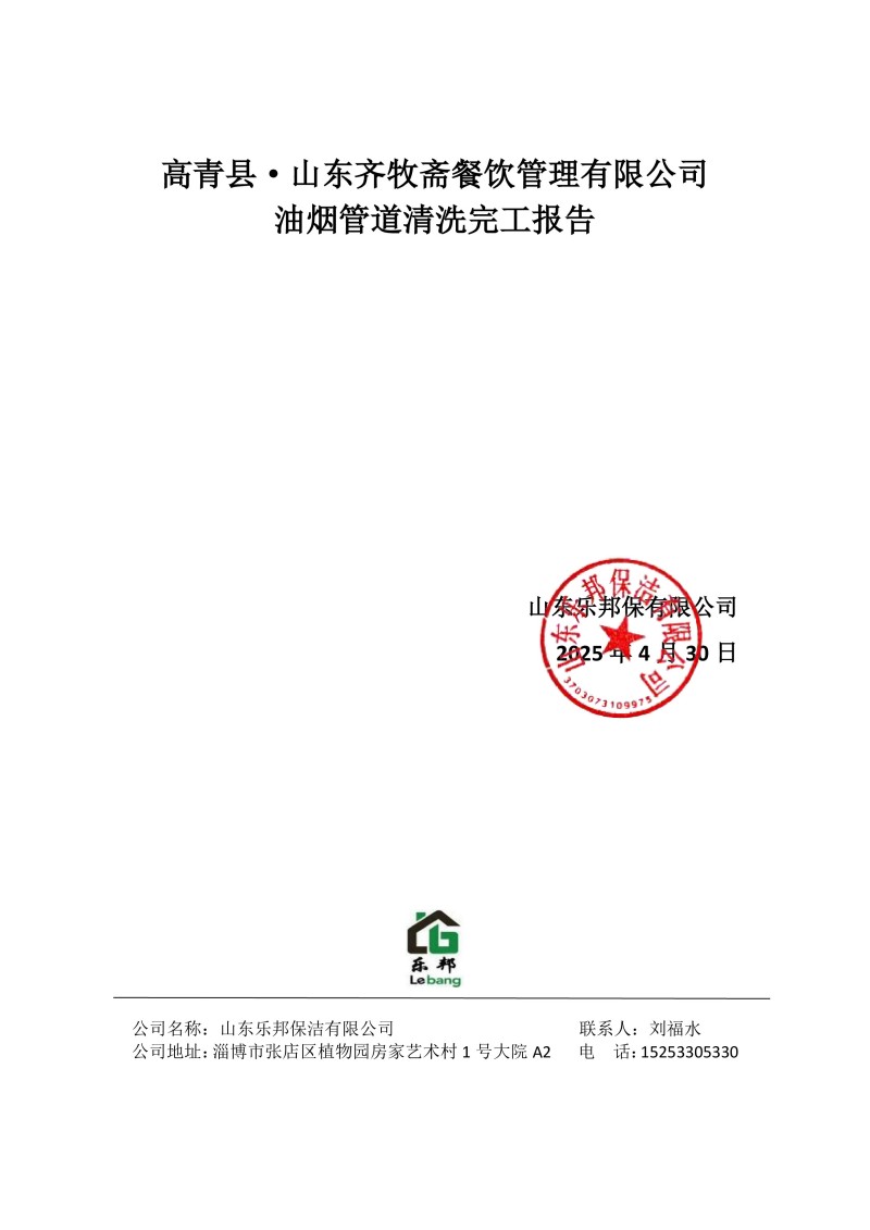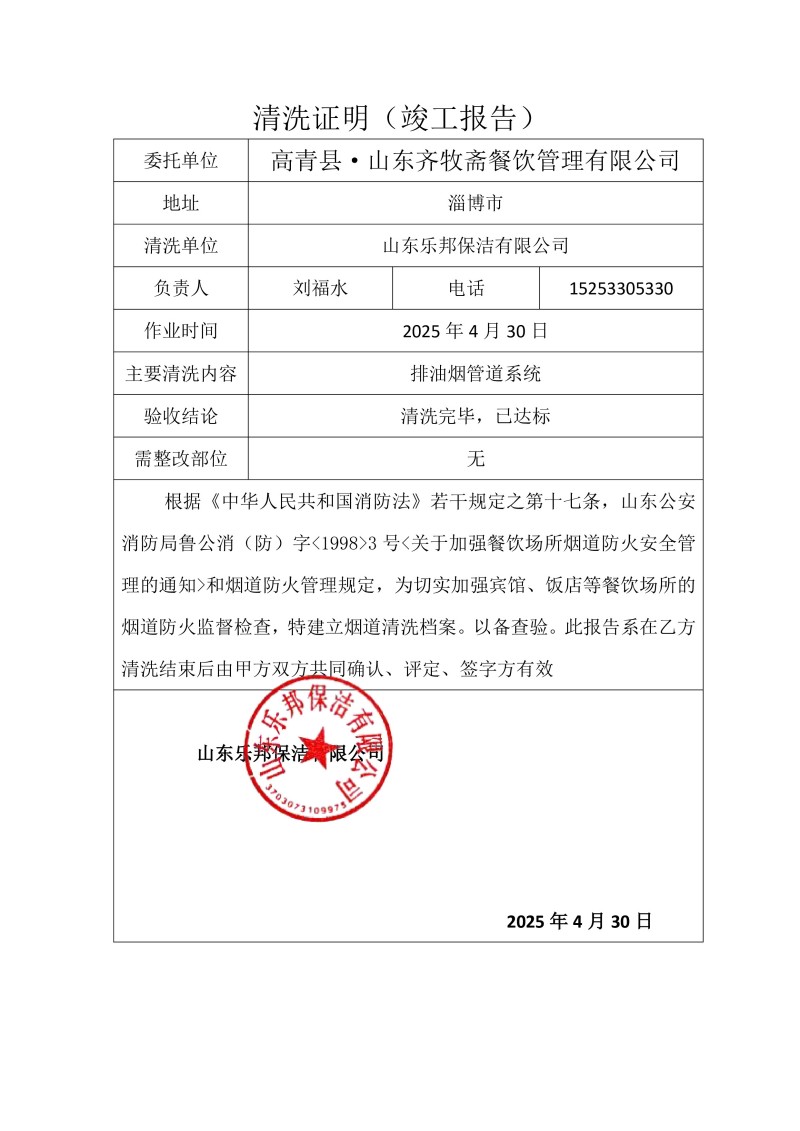 高青縣·山東齊牧齋餐飲管理有限公司清洗報(bào)告25.4.30