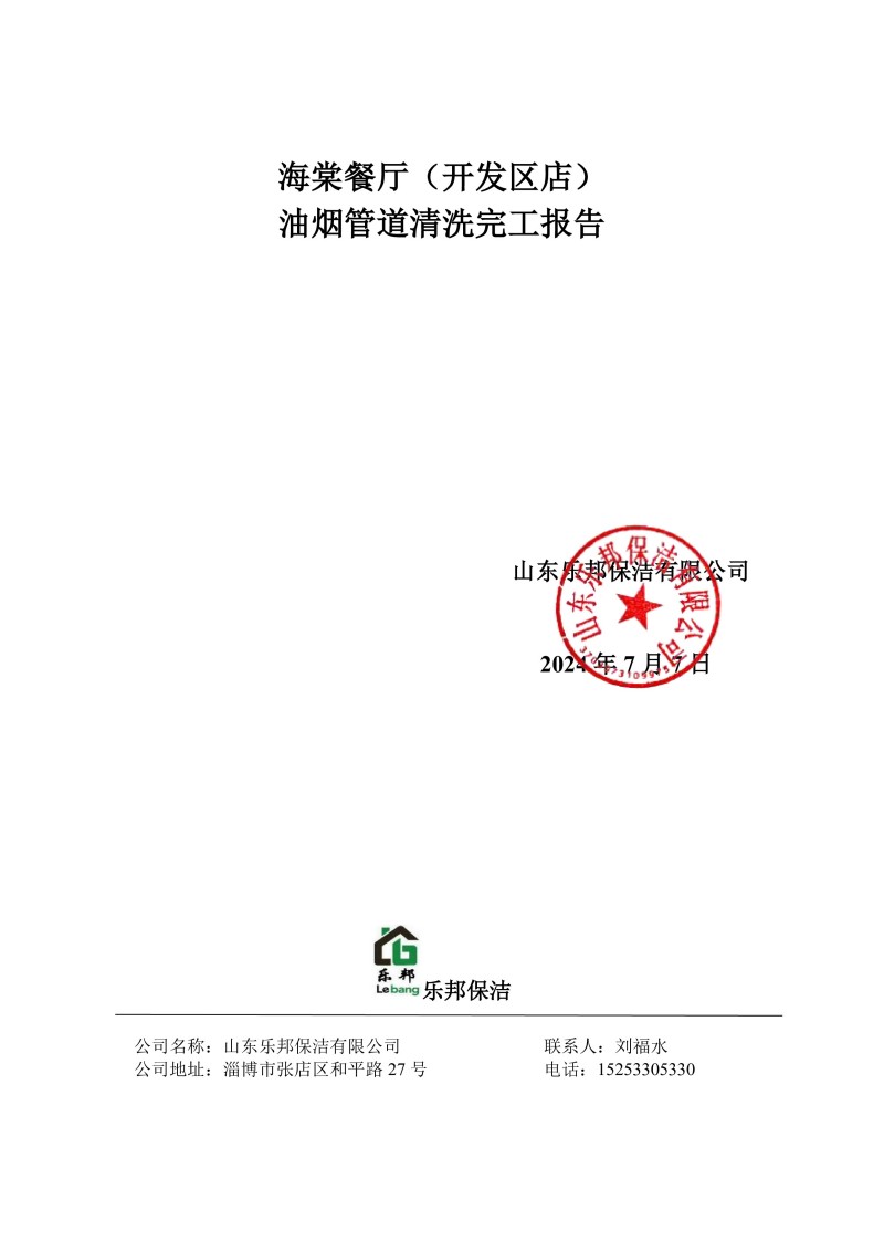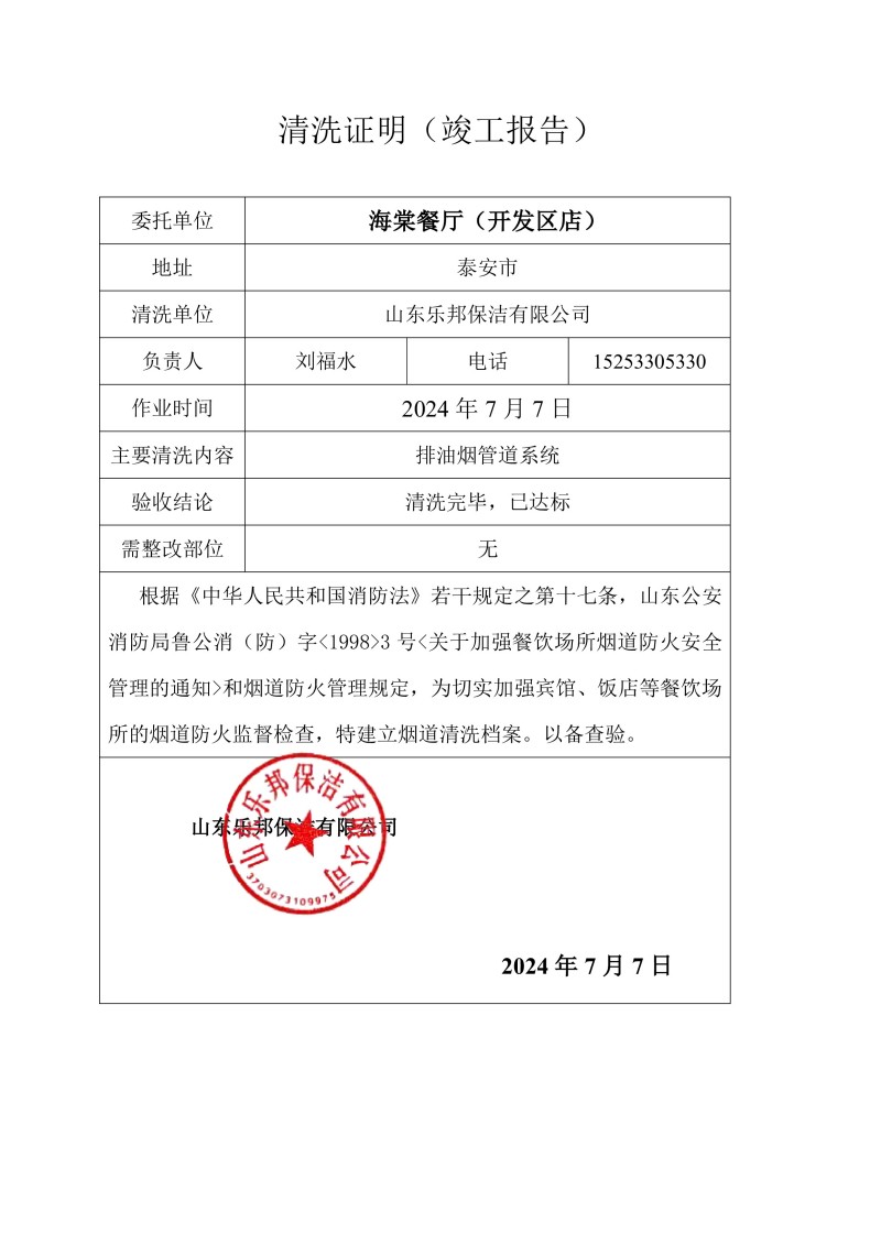 海棠餐廳(東岳大街店)清洗報(bào)告24.7.8