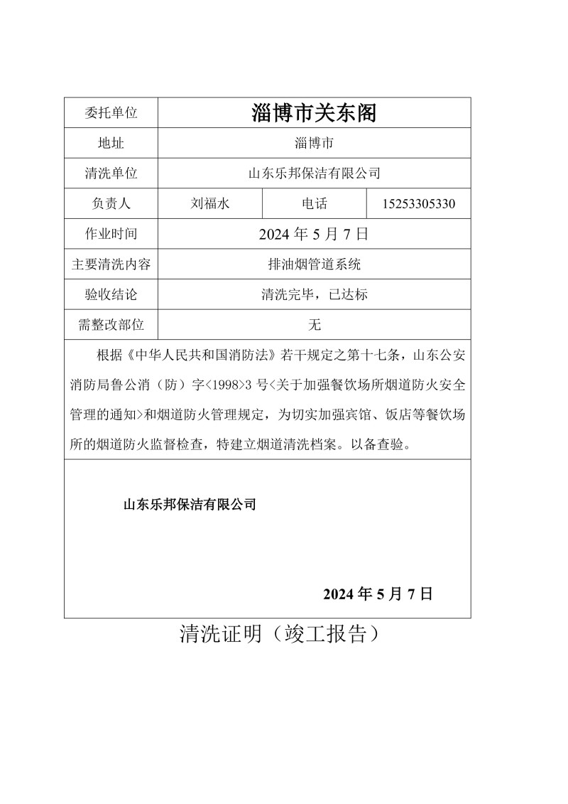 淄博市關(guān)東閣清洗報(bào)告24.5.7